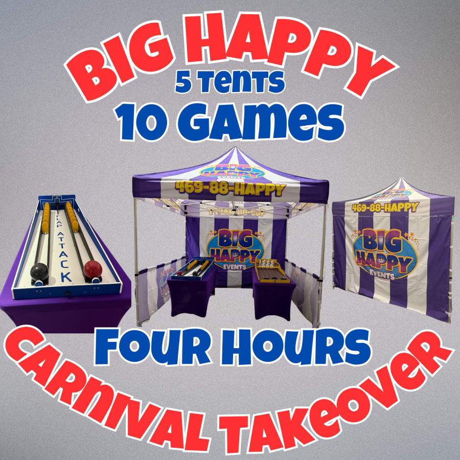 Step right up! The Big Happy Carnival Takeover Package brings all the fun of the midway to your event with a colorful, interactive setup that’s perfect for guests of all ages. Whether you're hosting a school carnival, birthday party, corporate event, or community festival, this package delivers laughter, challenge, and nonstop entertainment.