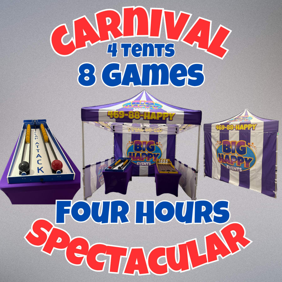 Step right up! The Big Happy Carnival Spectacular Package brings all the fun of the midway to your event with a colorful, interactive setup that’s perfect for guests of all ages. Whether you're hosting a school carnival, birthday party, corporate event, or community festival, this package delivers laughter, challenge, and nonstop entertainment.